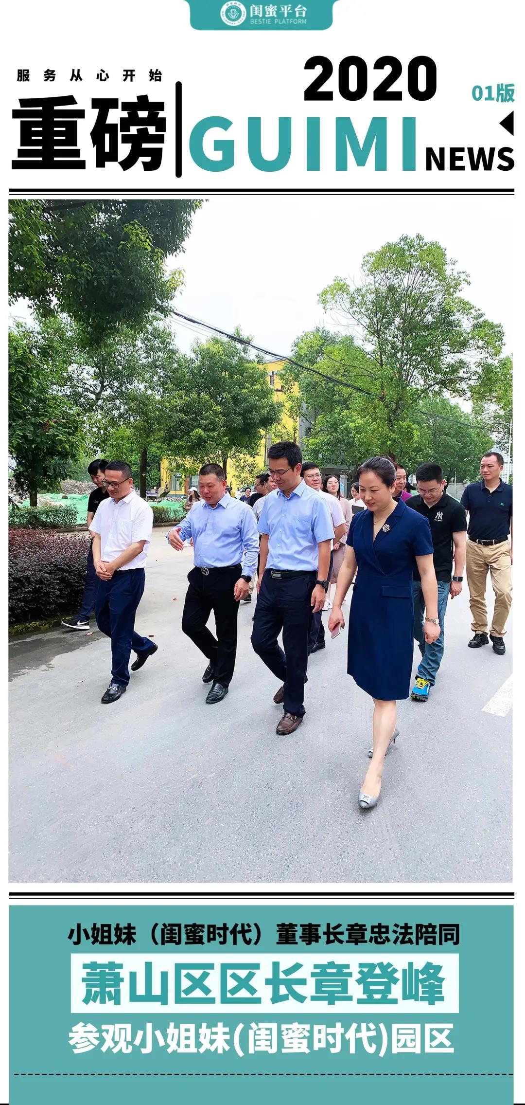 2020年7月18日上午,杭州市萧山区区长章登峰一行莅临小姐妹(闺蜜时代)园区指导工作。在闺蜜时代(小姐妹)董事长章忠法的陪同下,章登峰区长参观了小姐妹(闺蜜时代)园区。董事长章忠法向萧山区区长章登峰介绍闺蜜时代转型升级新战略——【最闺蜜战略】:闺蜜顾问化和生活化双向发展,向顾问化做“专”向生活化做”惠”,成就强大闺蜜生态圈。