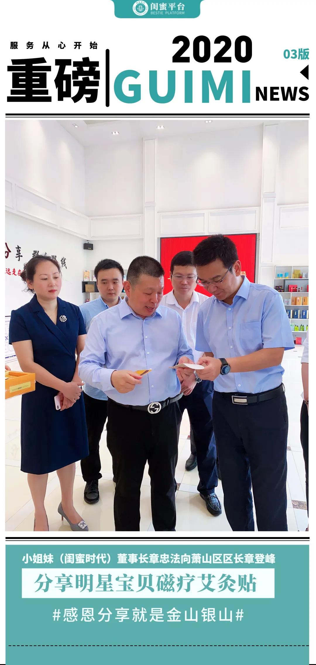 小姐妹(闺蜜时代)董事长章忠法向萧山区区长章登峰分享明星宝贝磁疗艾灸贴——感恩分享就是金山银山。
